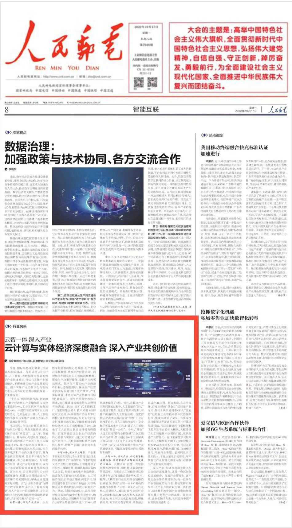 10月17日,工业和信息化部直属媒体《人民邮电报》刊载百度集团执行副总裁、百度智能云事业群总裁沈抖署名文章:《云智一体 深入产业 云计算与实体经济深度融合 深入产业共创价值》。